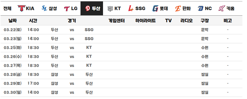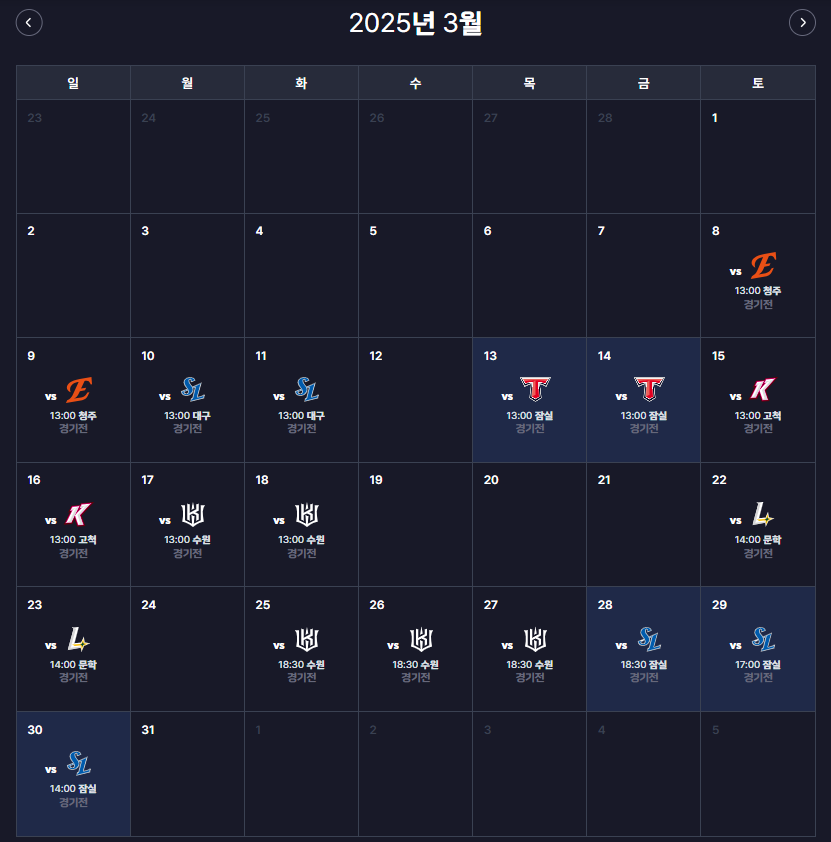 | 3월 13일(목) | 오후 1시 | 잠실 | SSG 랜더스 |