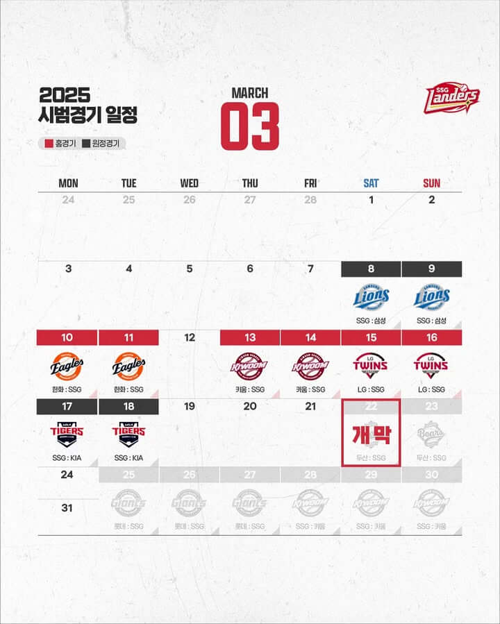 | 3월 15일(토) | SSG 랜더스 vs. LG 트윈스 | 인천 SSG랜더스필드 | 오후 1시 |